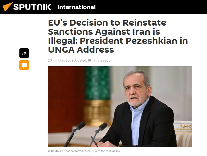 خبرگزاری «اسپوتنیک» روسیه هم این بخش از سخنان پزشکیان را برجسته ساخت که «تلاش اتحادیه اروپا، تحت فشار آمریکا، برای بازگرداندن تحریمهای ضدایرانی که در چارچوب توافق هستهای ۲۰۱۵ لغو شده بودند، غیرقانونی است.»