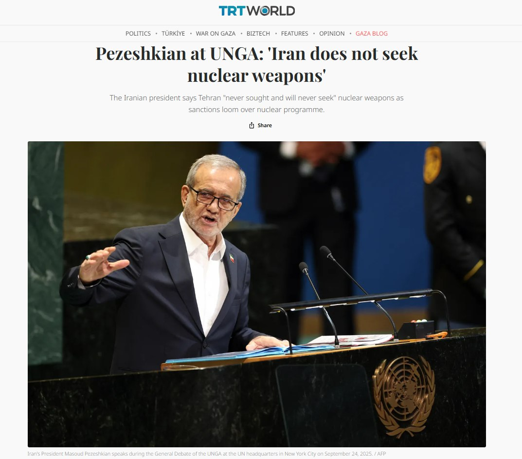 شبکه خبری «تیآرتی» ترکیه نیز به همین بخش از سخنان پزشکیان در مجمع عمومی توجه کرد و نوشت: رئیسجمهور ایران در سخنرانی خود در مجمع عمومی سازمان ملل متحد اعلام کرد که ایران هیچ قصدی برای ساخت سلاح هستهای ندارد.