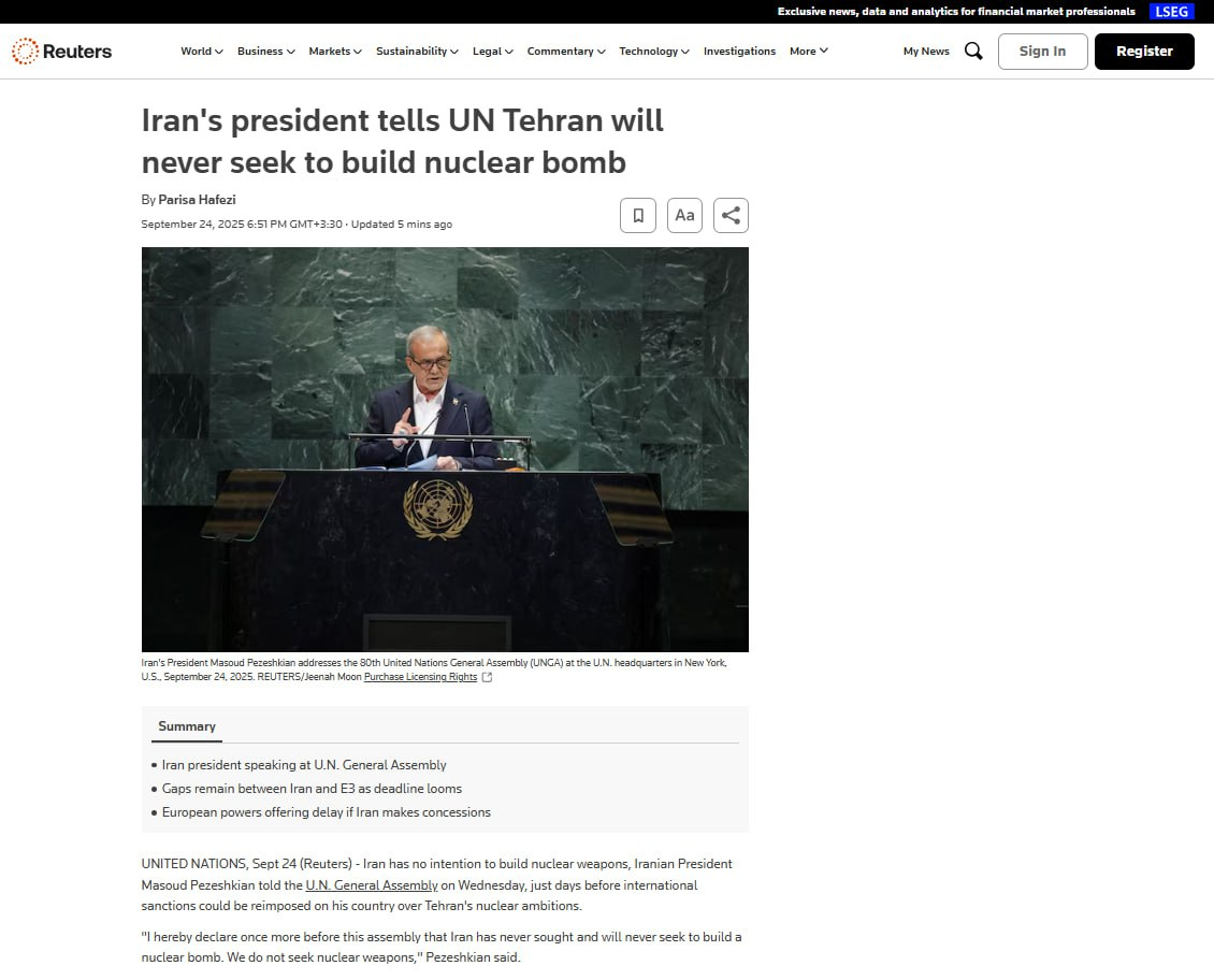 خبرگزاری رویترز هم با بازتاب سخنان رئیس جمهور ایران در مجمع عمومی گزارش داد: مسعود پزشکیان، رئیس جمهور ایران، تنها چند روز پیش از اعمال مجدد تحریمهای بینالمللی علیه کشورش، در مجمع عمومی سازمان ملل متحد گفت که ایران هیچ قصدی برای ساخت سلاح هستهای ندارد.