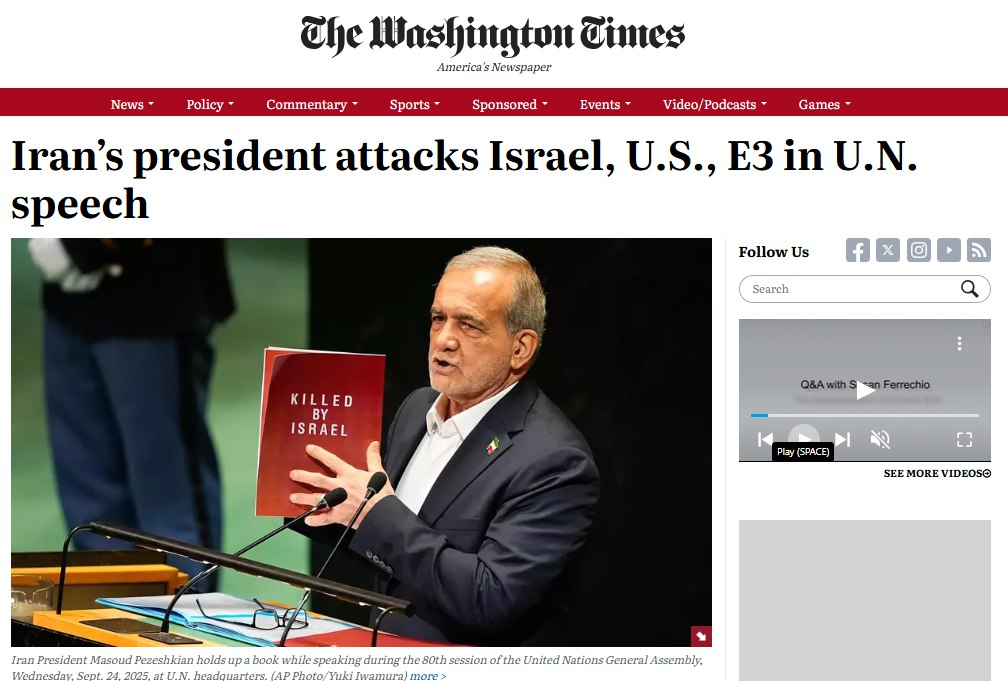 روزنامه «واشنگتن تایمز» آمریکا نیز در این رابطه نوشت: رئیسجمهور ایران در سخنرانی در سازمان ملل، اسرائیل، آمریکا و سه کشور اروپایی را مورد انتقاد قرار داد.