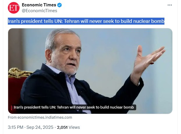 روزنامه «اکونومیک تایمز» هم در این رابطه نوشت، رئیس جمهوری ایران در سازمان ملل گفت «ایران هرگز به دنبال ساخت سلاح هسته ای نیست.»