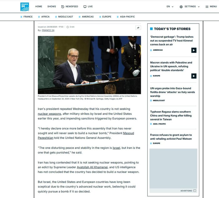 شبکه خبری فرانس ۲۴ هم در گزارش خود از سخنرانی رئیس جمهور ایران در مجمع عمومی به نقل از پزشکیان نوشت: کسی که صلح و ثبات منطقه را بر هم میزند اسرائیل است، اما این ایران است که مجازات میشود.